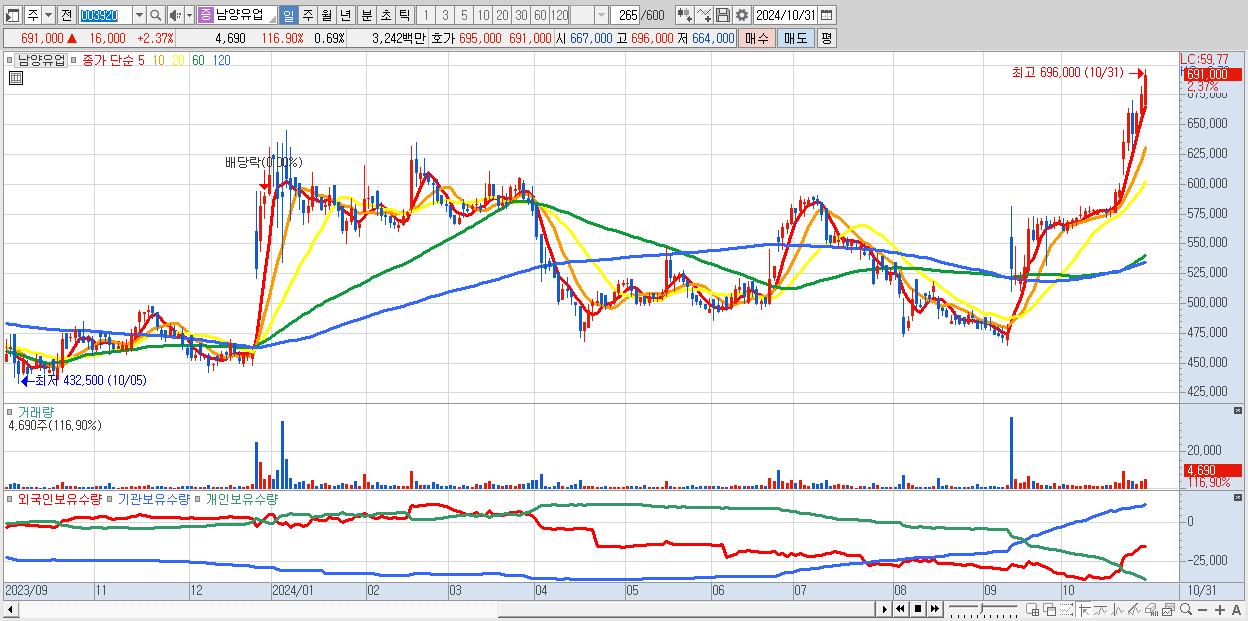 - 남양유업 (691,000원 ▲ 2.37% , 시총: 4,697억, 거래량: 4,690, 거래대금:32억, KOSPI)