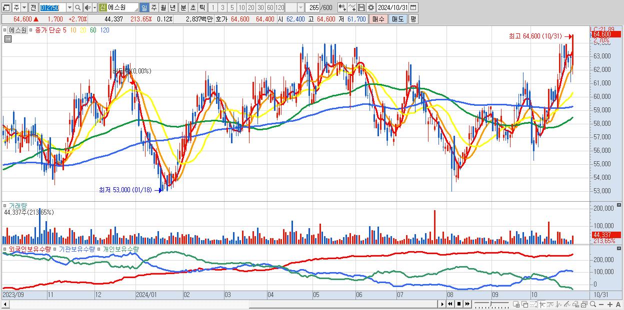 - 에스원 (64,600원 ▲ 2.7% , 시총: 24,547억, 거래량: 44,337, 거래대금:28억, KOSPI)