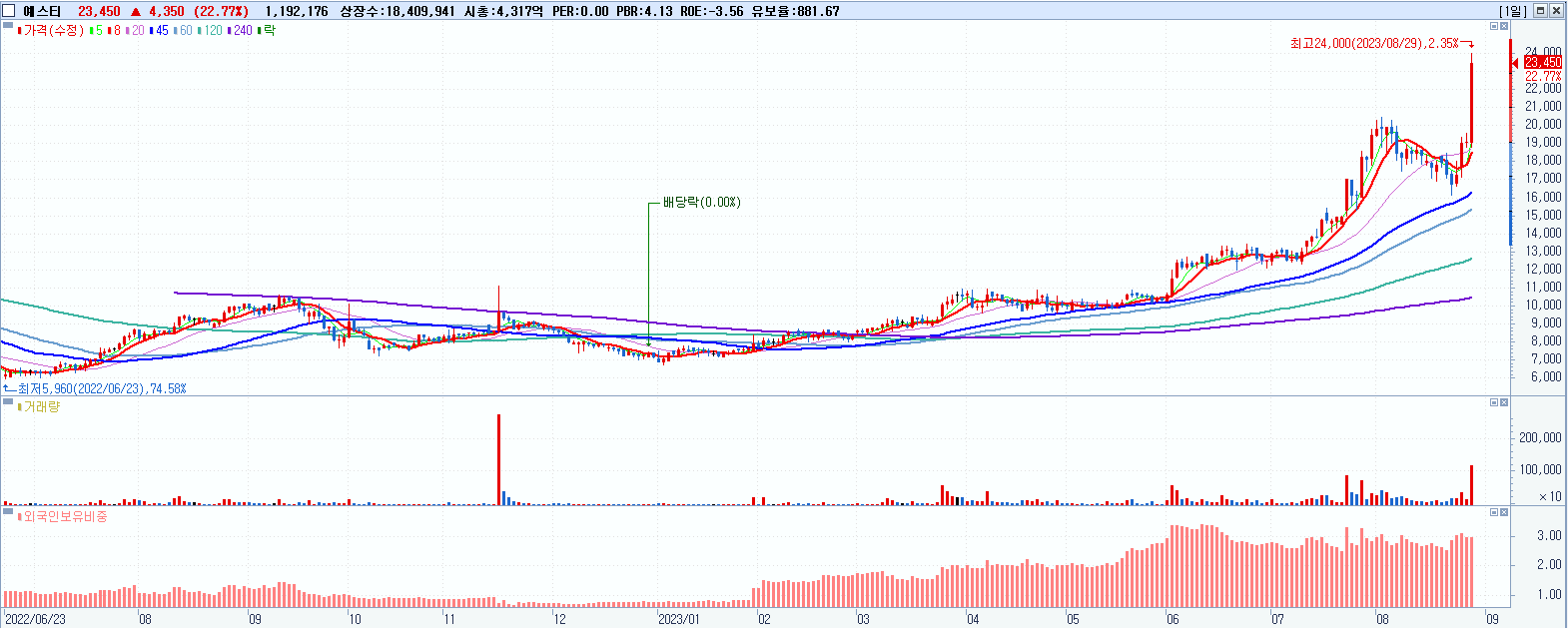 예스티 23,450원 ▲ 22.77% (KOSDAQ, 122640)