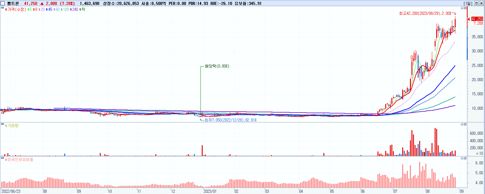 - 펩트론 (41,250원 ▲ 7.28% , 시총: 8,509억, 거래량: 1,464,779, 거래대금:578억, KOSDAQ)