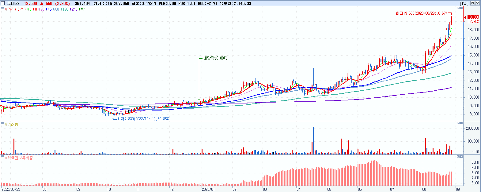 토비스 19,500원 ▲ 2.9% (KOSDAQ, 051360)