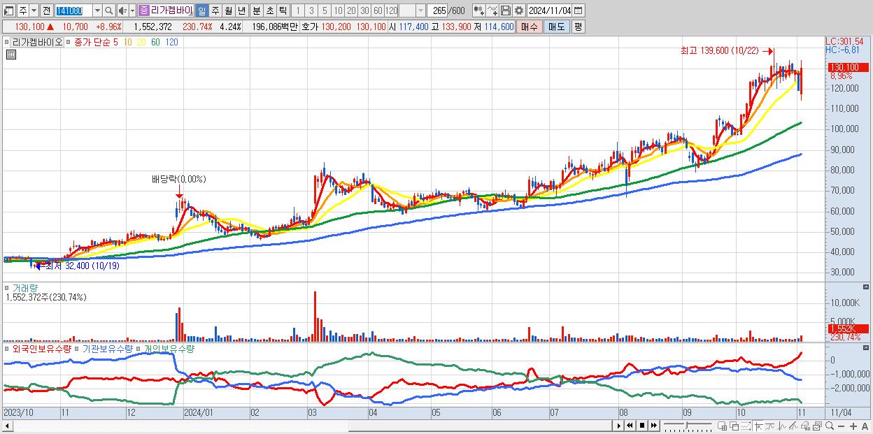 - 리가켐바이오 (130,100원 ▲ 8.96% , 시총: 47,630억, 외국인 순매수 거래금:268억)