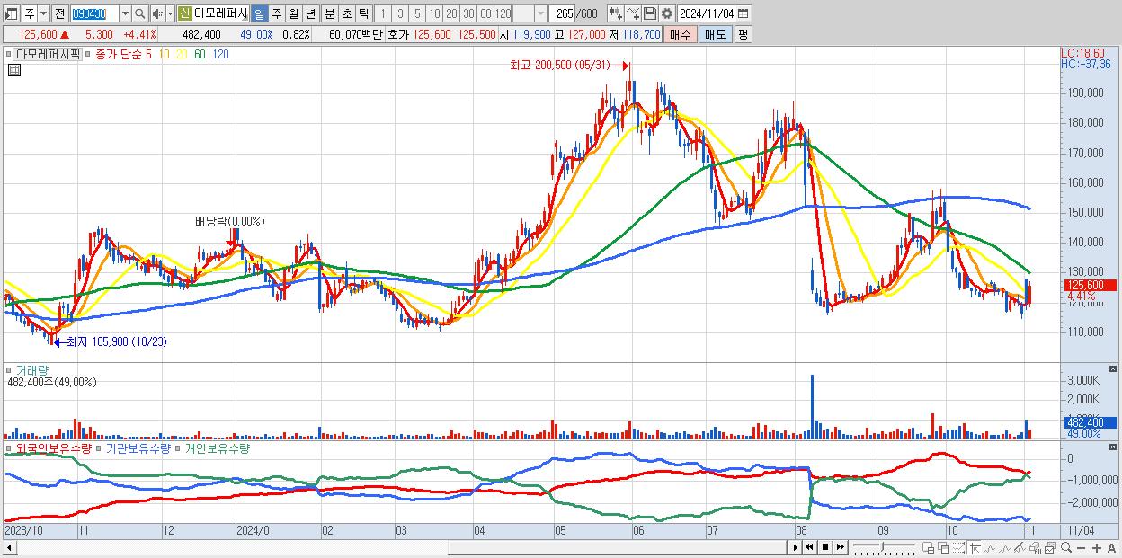 - 아모레퍼시픽 (125,600원 ▲ 4.41% , 시총: 73,467억, 외국인 순매수 거래금:148억)