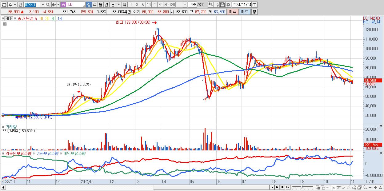 - HLB (66,900원 ▲ 4.86% , 시총: 87,898억, 외국인 순매수 거래금:108억)