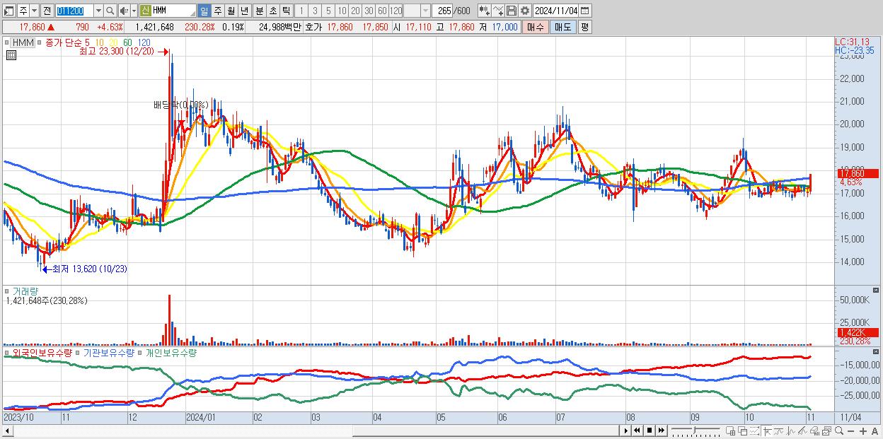 - HMM (17,860원 ▲ 4.63% , 시총: 133,778억, 외국인 순매수 거래금:113억)