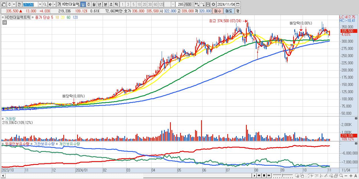 - HD현대일렉트릭 (335,500원 ▲ 4.03% , 시총: 120,938억, 외국인 순매수 거래금:143억)