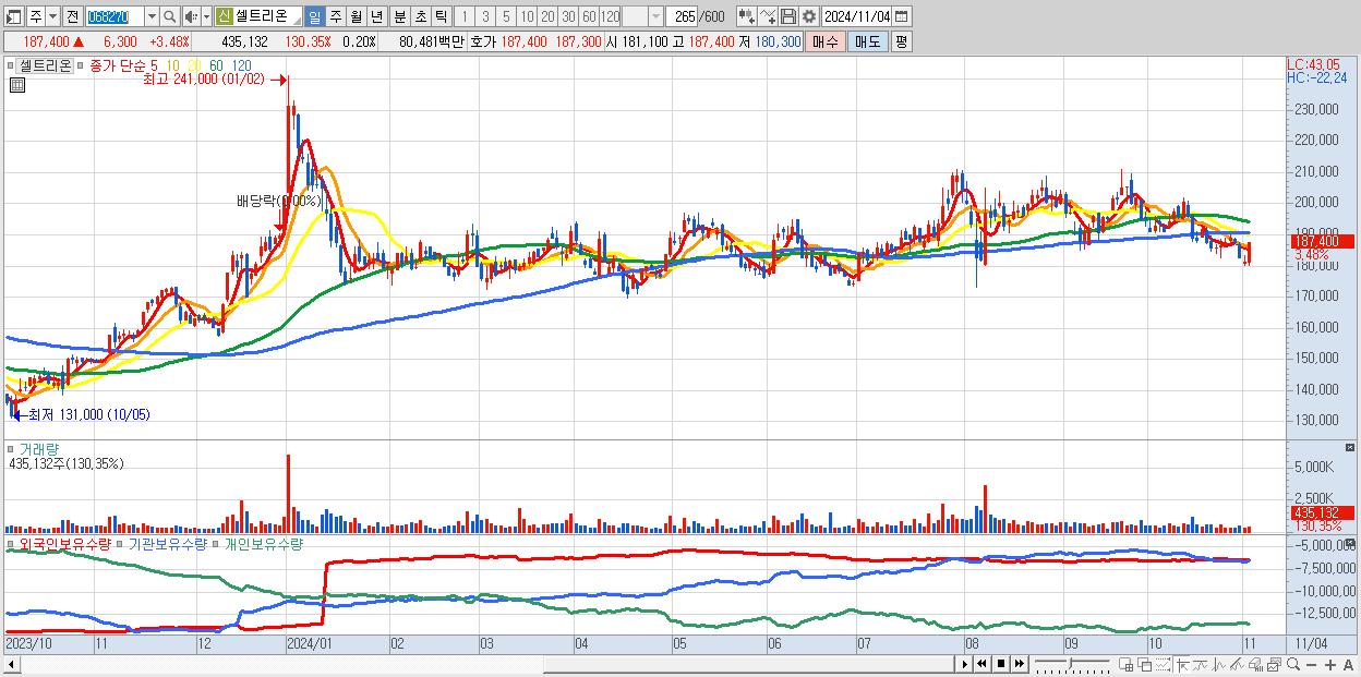 - 셀트리온 (187,400원 ▲ 3.48% , 시총: 406,698억, 외국인 순매수 거래금:75억)