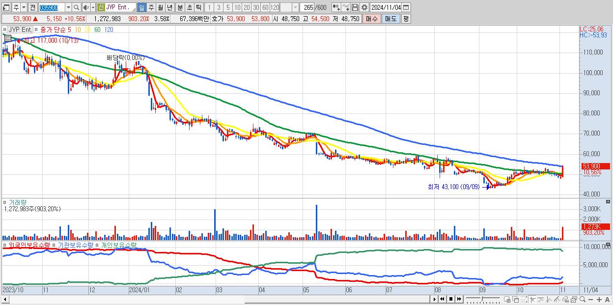 - JYP Ent. (53,900원 ▲ 10.56% , 시총: 19,152억, 외국인 순매수 거래금:199억)