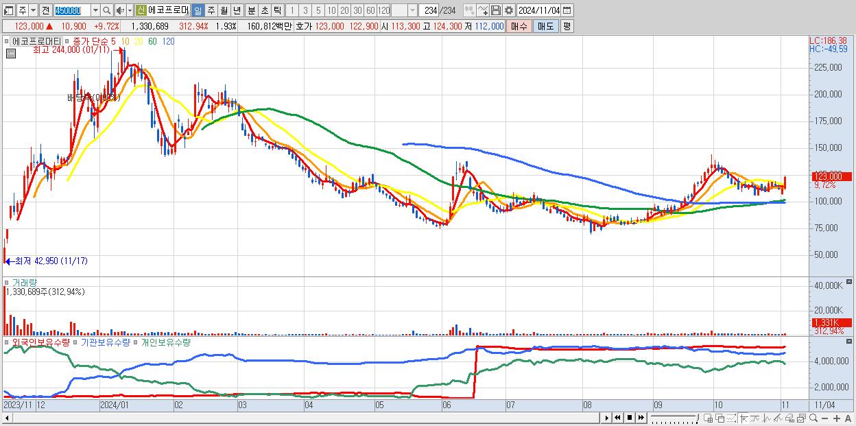 - 에코프로머티 (123,000원 ▲ 9.72% , 시총: 84,957억, 외국인 순매수 거래금:128억)