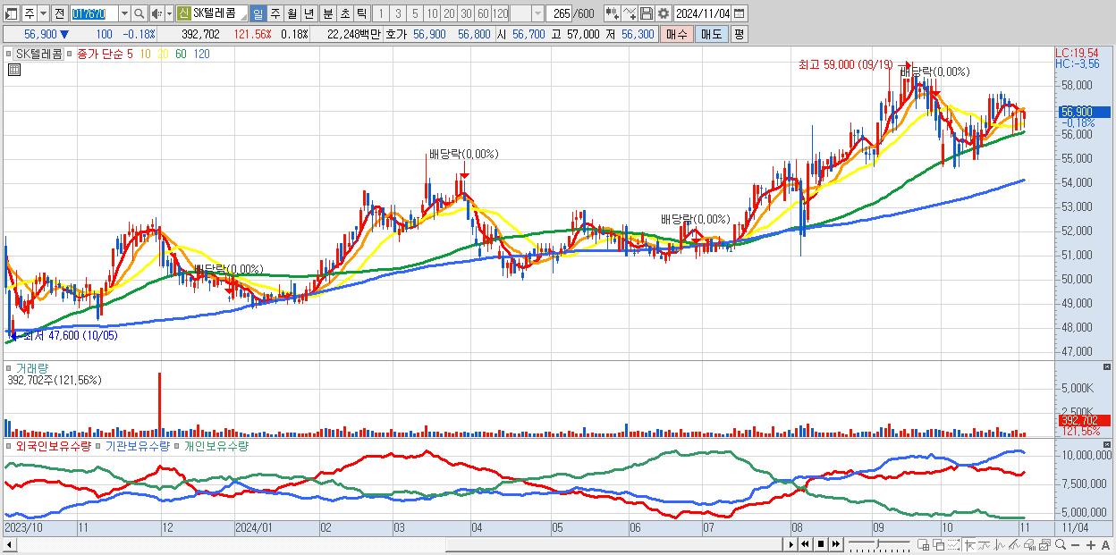 - SK텔레콤 (56,900원 ▼ -0.18% , 시총: 122,216억, 외국인 순매수 거래금:77억)