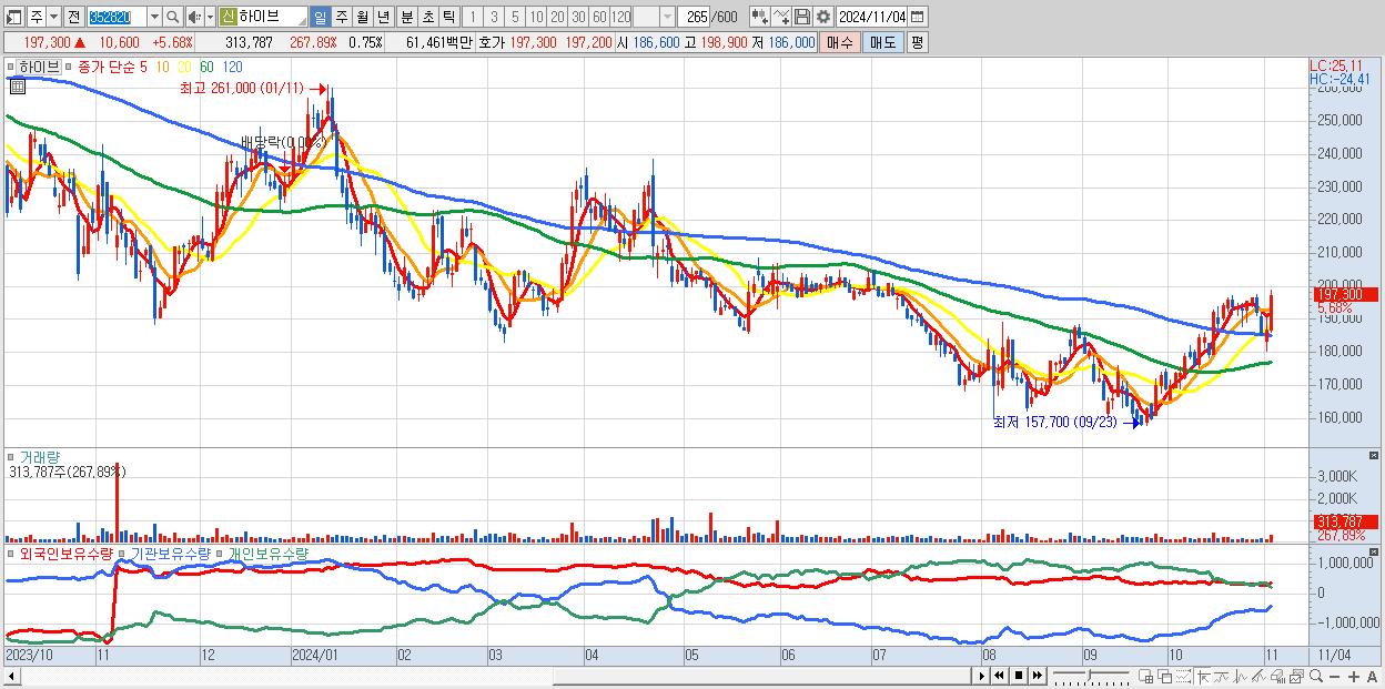 - 하이브 (197,300원 ▲ 5.68% , 시총: 82,180억, 외국인 순매수 거래금:102억)