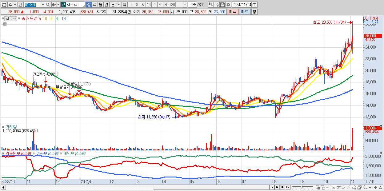 - 지누스 (26,000원 ▲ 4% , 시총: 5,268억, 거래량: 1,200,406, 거래대금:313억, KOSPI)