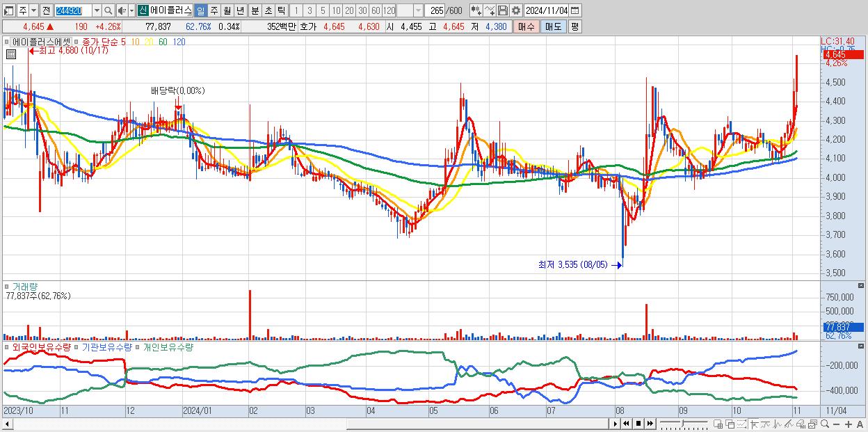 - 에이플러스에셋 (4,645원 ▲ 4.26% , 시총: 1,050억, 거래량: 77,837, 거래대금:4억, KOSPI)