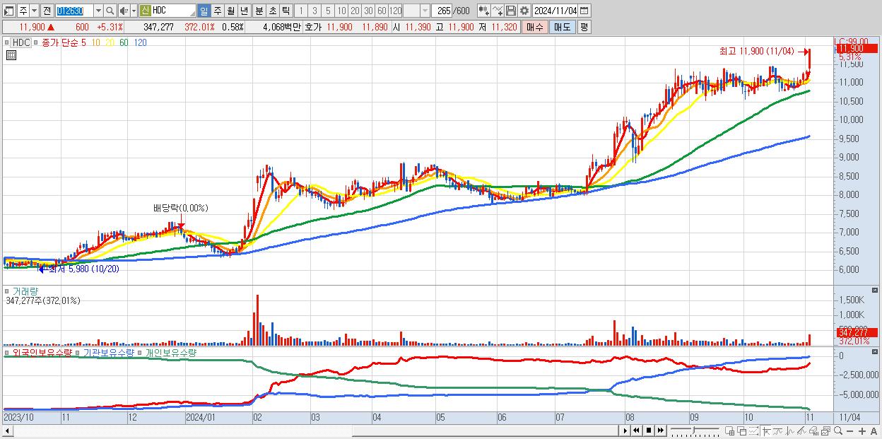 - HDC (11,900원 ▲ 5.31% , 시총: 7,109억, 거래량: 347,277, 거래대금:41억, KOSPI)