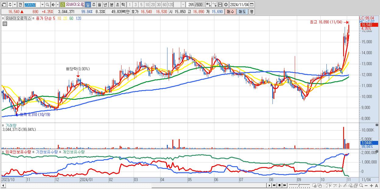 - 유바이오로직스 (16,540원 ▲ 4.35% , 시총: 6,043억, 거래량: 3,044,371, 거래대금:498억, KOSDAQ)