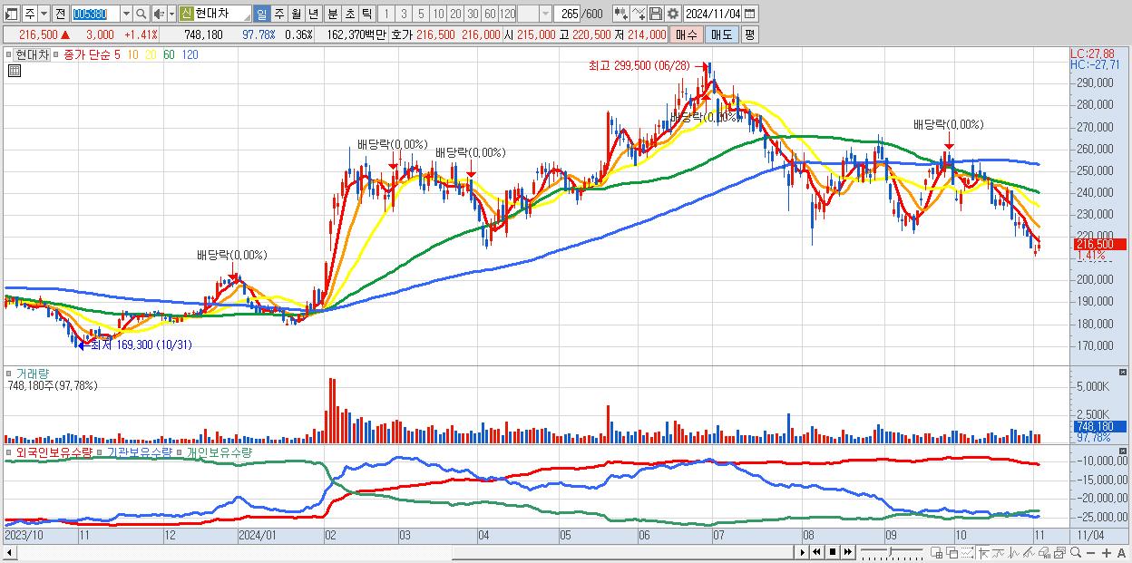 - 현대차 (216,500원 ▲ 1.41% , 시총: 453,386억, 거래량: 748,180, 거래대금:1,624억)