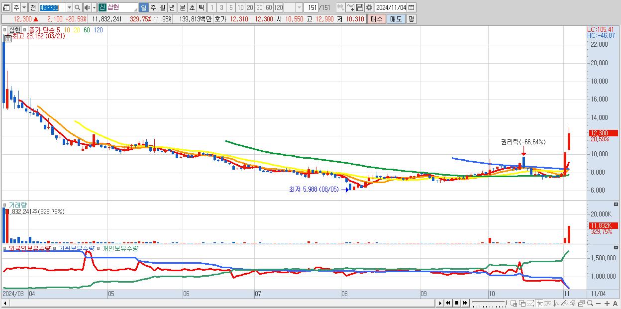 - 삼현 (12,300원 ▲ 20.59% , 시총: 1,300억, 거래량: 11,832,241, 거래대금:1,398억)