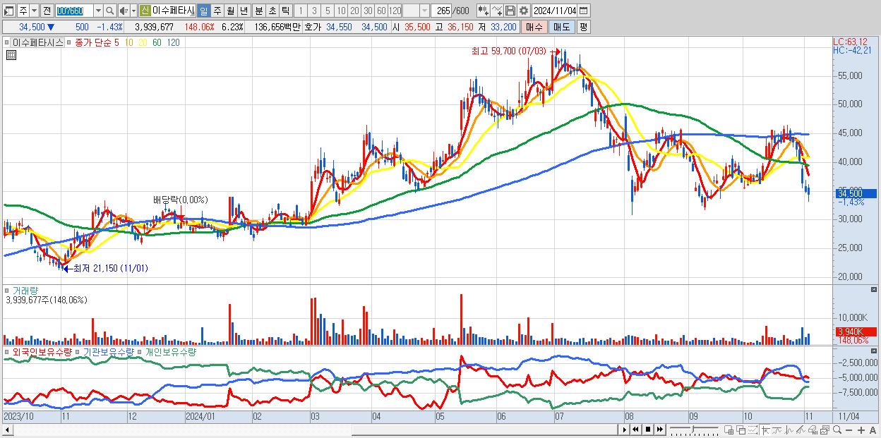 - 이수페타시스 (34,500원 ▼ -1.43% , 시총: 21,820억, 거래량: 3,939,677, 거래대금:1,367억)