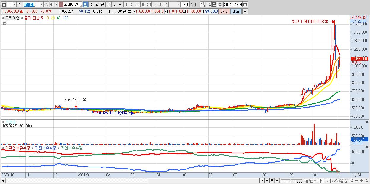 - 고려아연 (1,085,000원 ▲ 8.07% , 시총: 224,631억, 거래량: 105,027, 거래대금:1,112억)