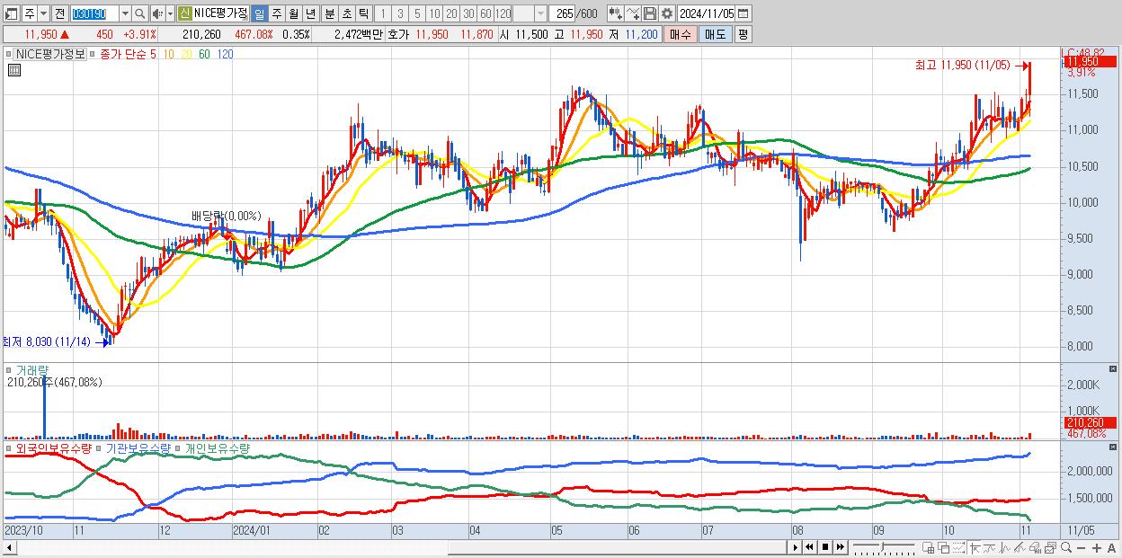 - NICE평가정보 (11,950원 ▲ 3.91% , 시총: 7,183억, 거래량: 210,260, 거래대금:25억, KOSPI)