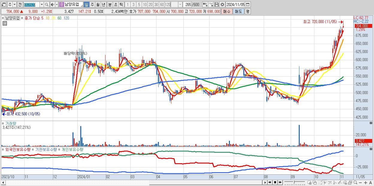 - 남양유업 (704,000원 ▲ 1.29% , 시총: 4,785억, 거래량: 3,427, 거래대금:24억, KOSPI)