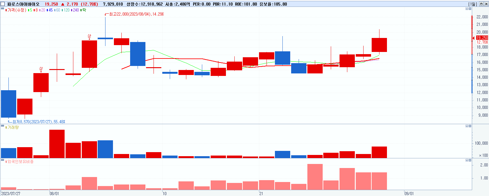 - 파로스아이바이오 (19,250원 ▲ 12.7% , 시총: 2,487억, 거래량: 7,960,733, 거래대금:1,495억)