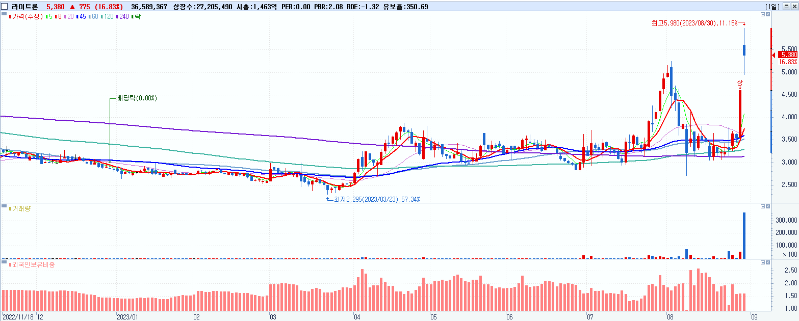 - 라이트론 (5,380원 ▲ 16.83% , 시총: 1,464억, 거래량: 36,792,485, 거래대금:2,049억)