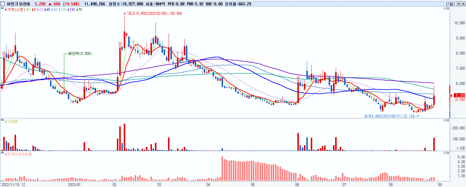 - 하인크코리아 (5,200원 ▲ 14.54% , 시총: 984억, 거래량: 11,542,938, 거래대금:616억)