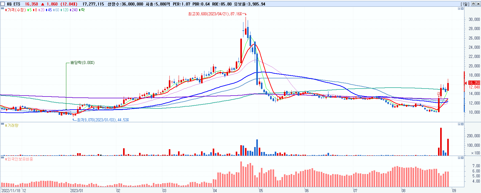 - KG ETS (16,350원 ▲ 12.84% , 시총: 5,886억, 거래량: 17,309,185, 거래대금:2,822억)