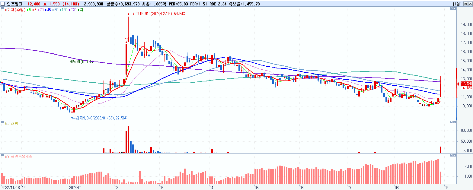 - 인포뱅크 (12,480원 ▲ 14.18% , 시총: 1,085억, 거래량: 2,911,355, 거래대금:371억)