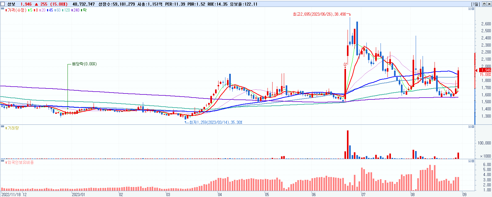 - 상보 (1,946원 ▲ 15.08% , 시총: 1,152억, 거래량: 42,844,504, 거래대금:813억)