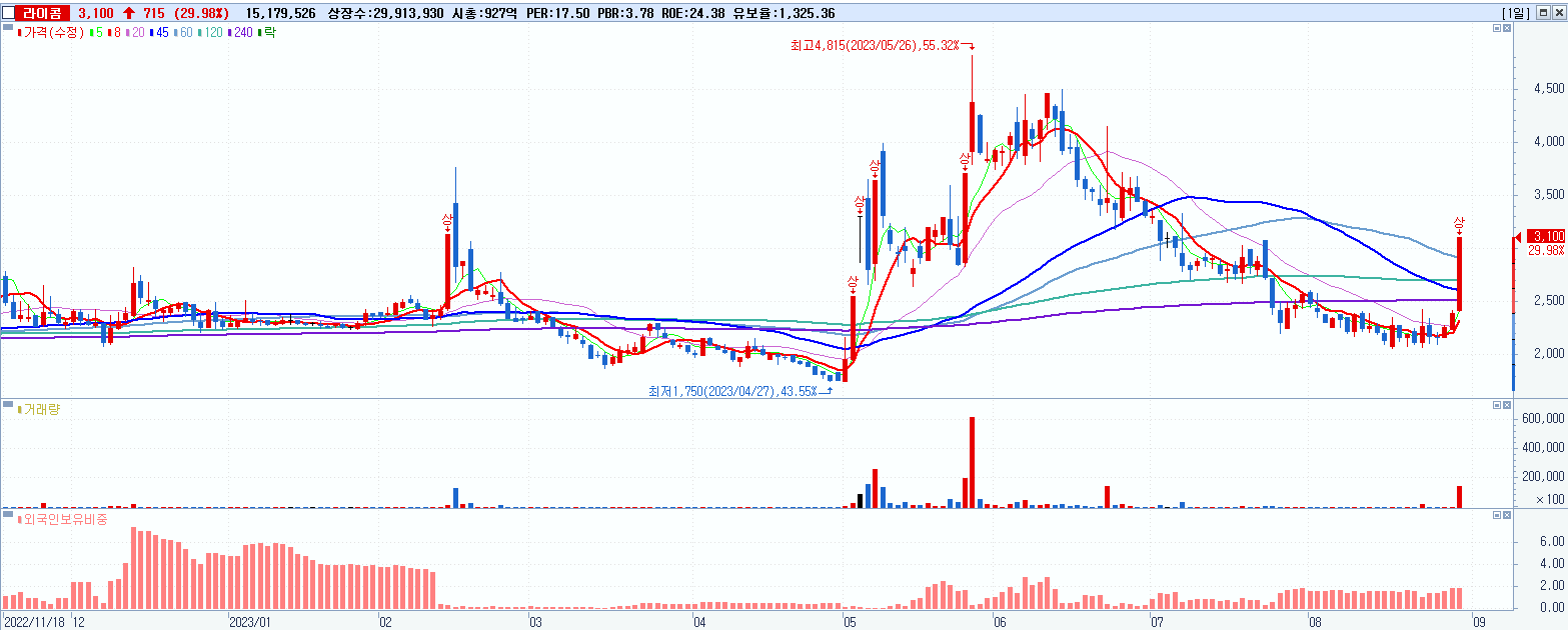 - 라이콤 (3,100원 ▲ 29.98% , 시총: 927억, 거래량: 15,180,941, 거래대금:451억)