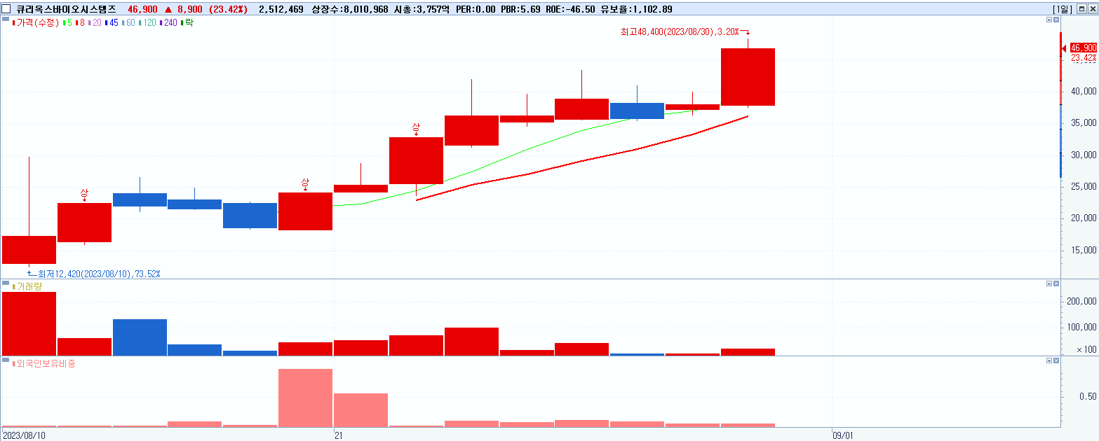 - 큐리옥스바이오시스템즈 (46,900원 ▲ 23.42% , 시총: 3,757억, 거래량: 2,522,406, 거래대금:1,104억)