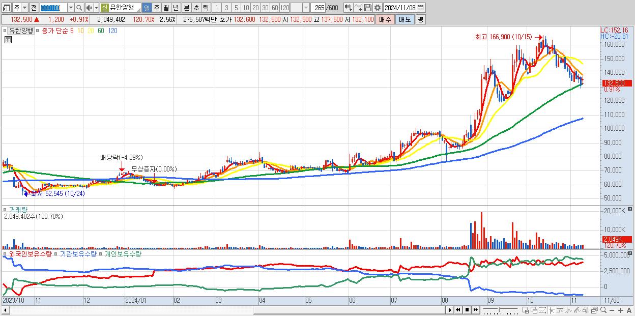 - 유한양행 (132,500원 ▲ 0.91% , 시총: 106,277억, 외국인 순매수 거래금:143억)