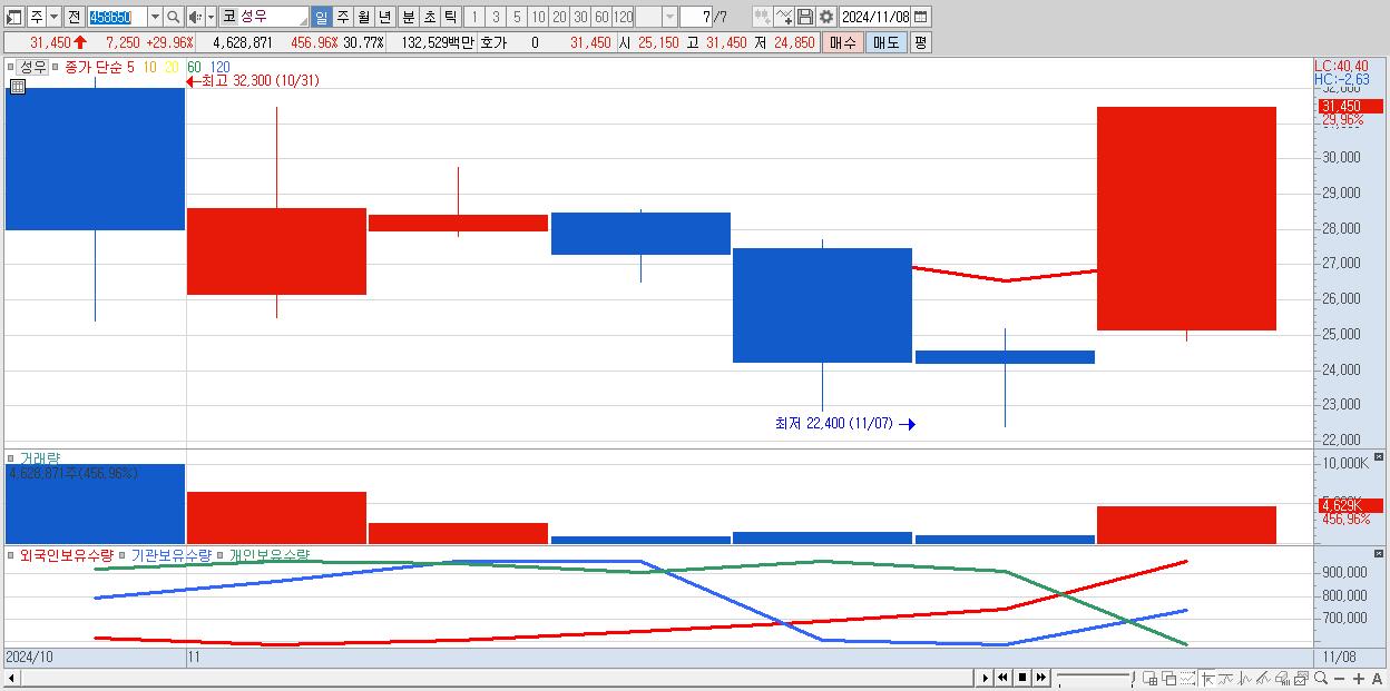 - 성우 (31,450원 ▲ 29.96% , 시총: 4,732억, 외국인 순매수 거래금:51억)