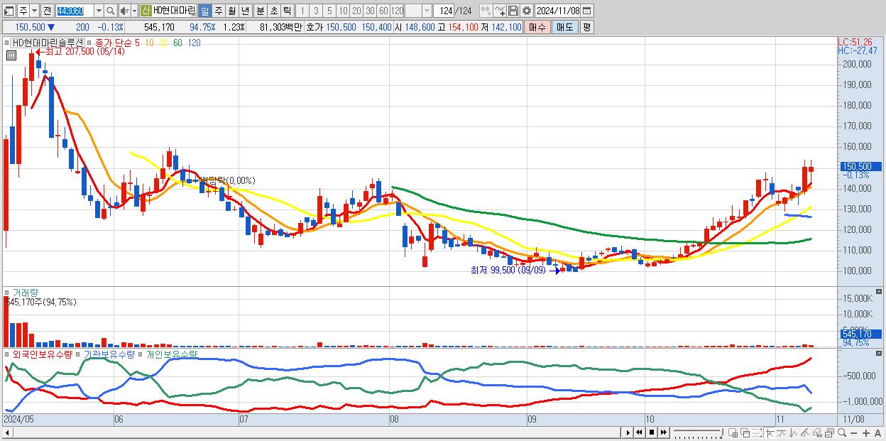 - HD현대마린솔루션 (150,500원 ▼ -0.13% , 시총: 66,897억, 외국인 순매수 거래금:148억)