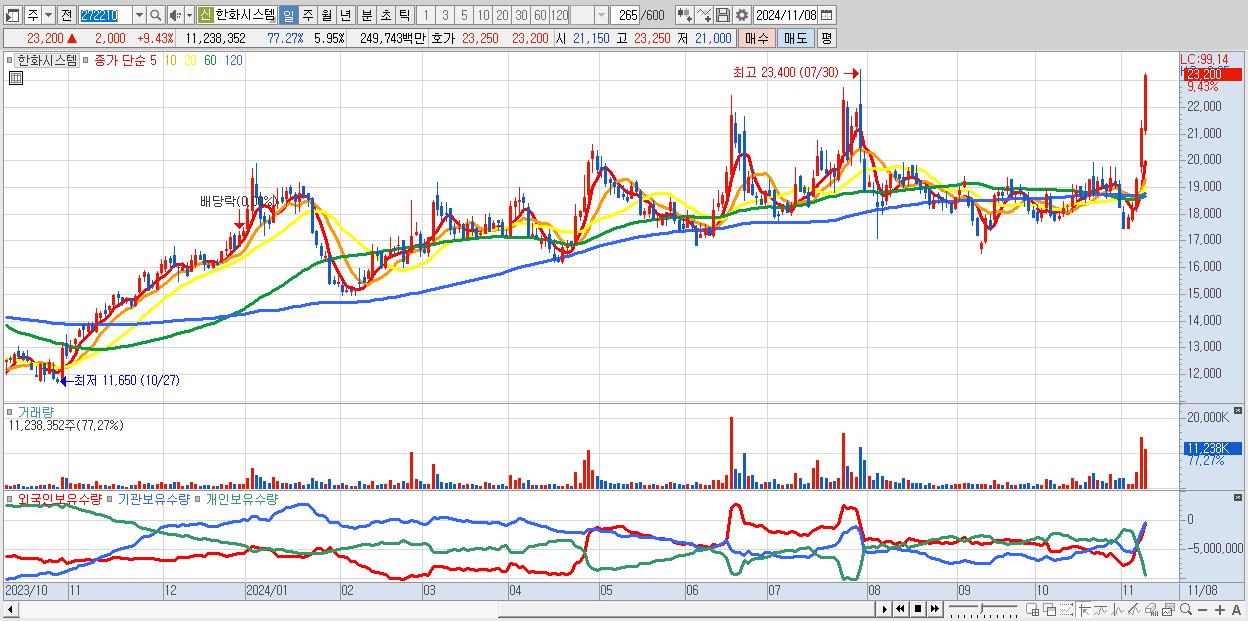 - 한화시스템 (23,200원 ▲ 9.43% , 시총: 43,829억, 외국인 순매수 거래금:459억)