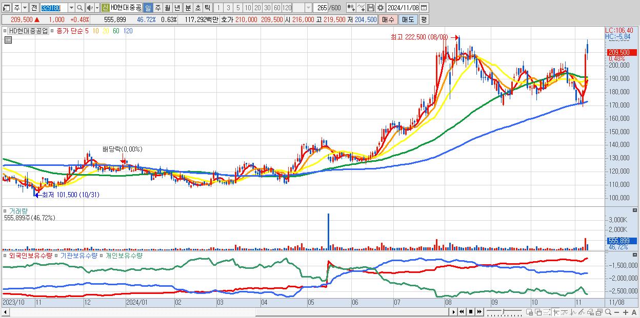 - HD현대중공업 (209,500원 ▲ 0.48% , 시총: 185,980억, 외국인 순매수 거래금:66억)