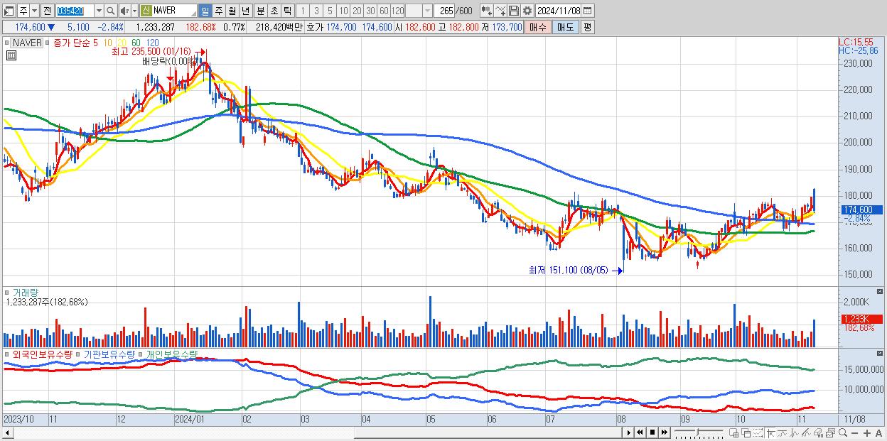 - NAVER (174,600원 ▼ -2.84% , 시총: 280,730억, 거래량: 1,226,829, 거래대금:2,173억)