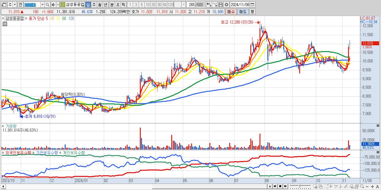 - 삼성중공업 (11,010원 ▲ 1.66% , 시총: 96,888억, 거래량: 11,314,937, 거래대금:1,235억)