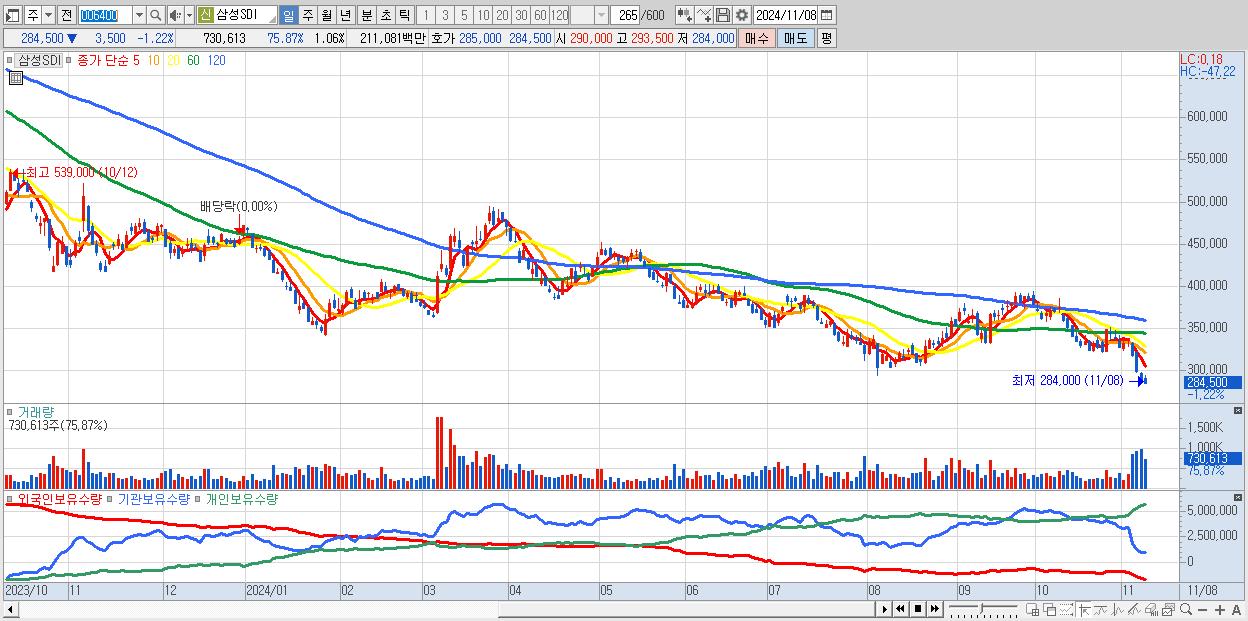 - 삼성SDI (284,500원 ▼ -1.22% , 시총: 195,635억, 거래량: 721,831, 거래대금:2,086억)