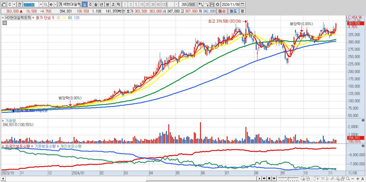 - HD현대일렉트릭 (363,500원 ▲ 4.76% , 시총: 131,031억, 거래량: 392,296, 거래대금:1,410억)