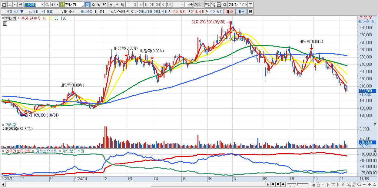 - 현대차 (203,500원 ▼ -1.93% , 시총: 426,162억, 거래량: 707,930, 거래대금:1,456억)