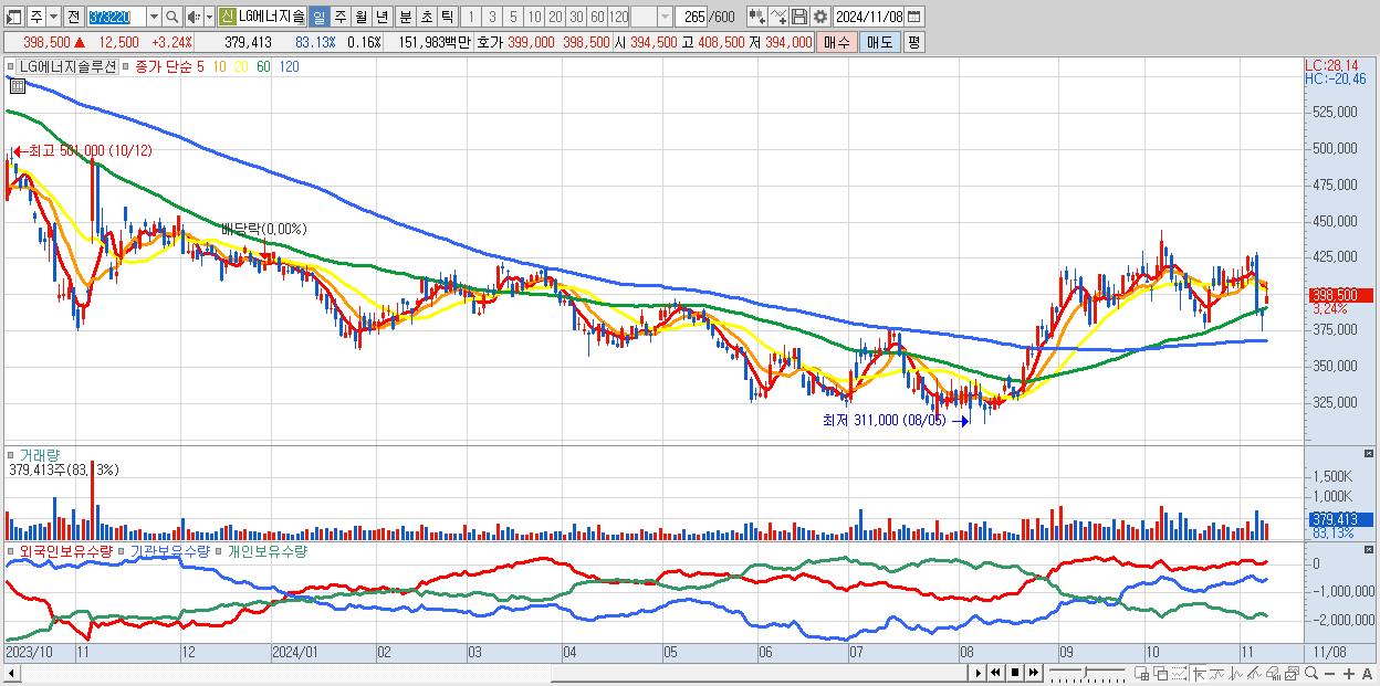 - LG에너지솔루션 (398,500원 ▲ 3.24% , 시총: 932,490억, 거래량: 376,212, 거래대금:1,507억)