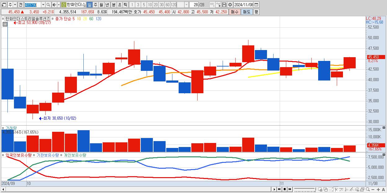 - 한화인더스트리얼솔루션즈 (45,450원 ▲ 8.21% , 시총: 22,947억, 거래량: 4,322,315, 거래대금:1,930억)