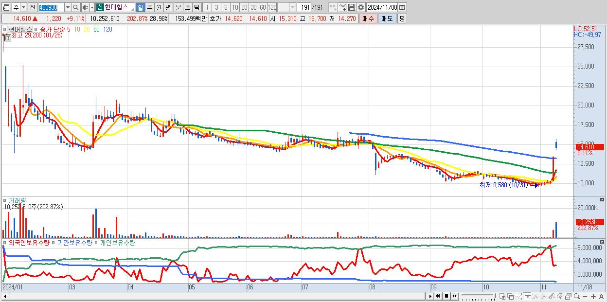 - 현대힘스 (14,610원 ▲ 9.11% , 시총: 5,169억, 거래량: 9,536,392, 거래대금:1,425억)