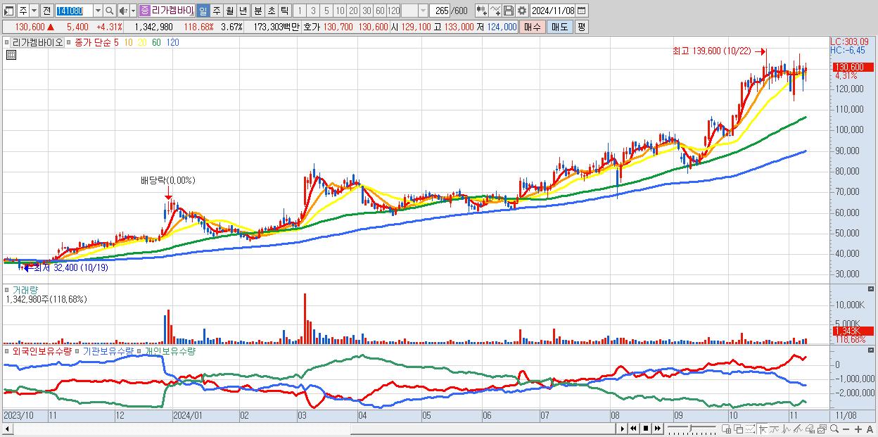 - 리가켐바이오 (130,600원 ▲ 4.31% , 시총: 47,813억, 거래량: 1,338,142, 거래대금:1,727억)