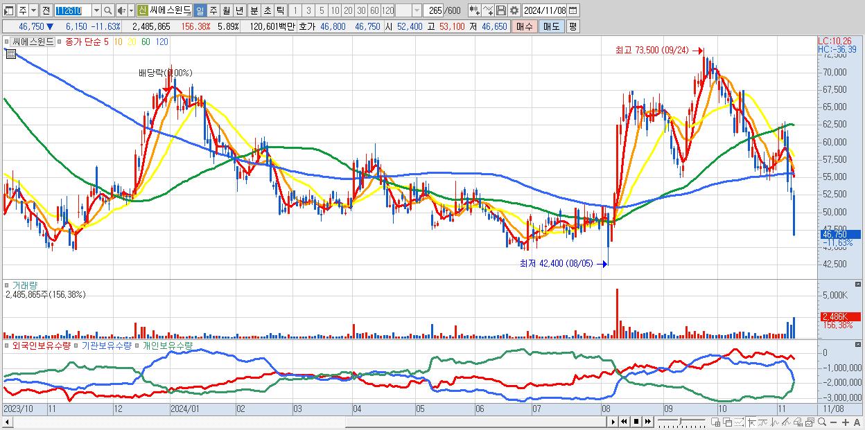 - 씨에스윈드 (46,750원 ▼ -11.63% , 시총: 19,715억, 거래량: 2,459,219, 거래대금:1,194억)