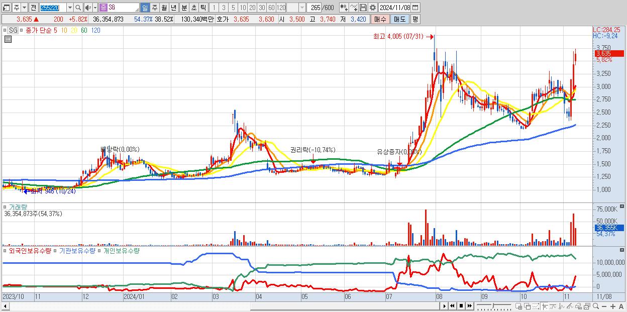 - SG (3,635원 ▲ 5.82% , 시총: 3,430억, 거래량: 35,793,025, 거래대금:1,283억)