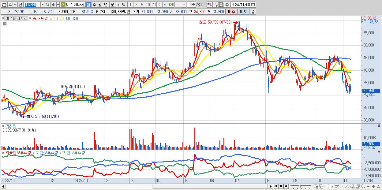 - 이수페타시스 (31,750원 ▼ -5.79% , 시총: 20,081억, 거래량: 3,776,314, 거래대금:1,243억)